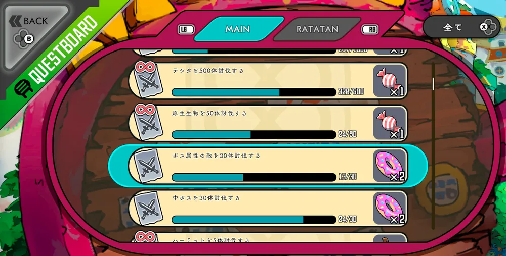 クエストボードの報酬としてドーナツを獲得できる課題がある。1回で複数のドーナツを獲得できる課題が多いので、クエストボードの報酬だけでもある程度確保可能だ。