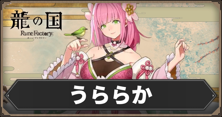 龍の国ルーンファクトリーの「うららか」について掲載しています。うららかの好みの交流・好物、絆スキルデータ、声優・プロフィールをまとめていますので、龍ファク / 龍の国ルンファクの攻略にお役立てください。