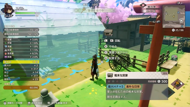 建物を建てれば建てるだけ主人公が強くなったり、里が豊かになったりするので、設置できる建物・置物はできるだけ建てておこう。