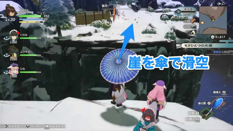 冬地方の東の小島に秘湯がある。目的地の反対側の小島に移動し、崖から傘の神器で滑空することで辿り着くことができる。