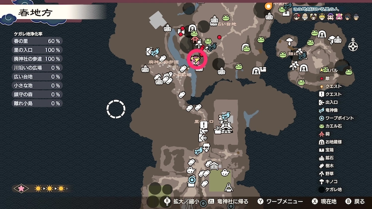 お地蔵さんの位置はマップにアイコンで示されているので、探索の過程でお地蔵さんを見つけたら都度掃除を進めよう