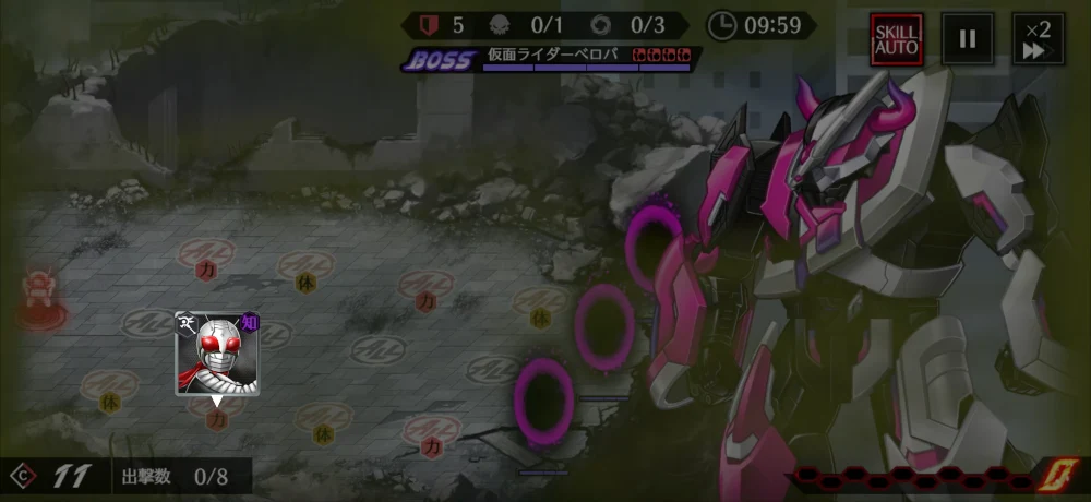 仮面ライダーV3を一番右上に配置することで、ボスのレーザーレーズライザー(自身から最も近い位置の味方ユニットを中心とした範囲攻撃)を継続的にいなせる。