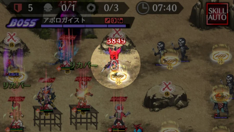 左と右上から飛んでくる遠隔攻撃は、仮面ライダーV3や仮面ライダーゴースト オレ魂で受け止め、高台の遠隔アタッカーを守る立ち回りが安定。