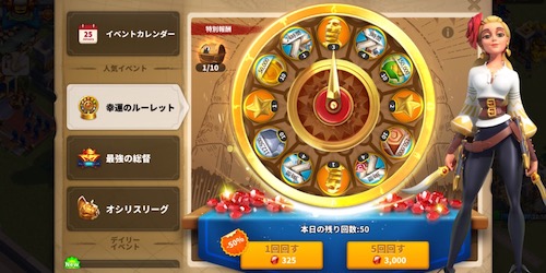 幸運のルーレットは開催期間中に1日1回無料で回すことができます。非常にお得なチャンスなので、無料分は必ず回しておくようにしましょう。