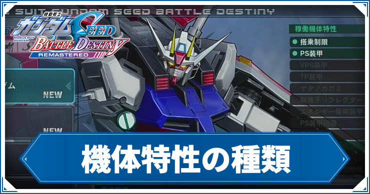 バトルデスティニーリマスターの「機体特性の種類と対策方法」について掲載しています。機体装甲の効果をまとめていますので、機動戦士ガンダムSEED BATTLE DESTINY REMASTERED (switch/steam)の攻略にお役立てください。