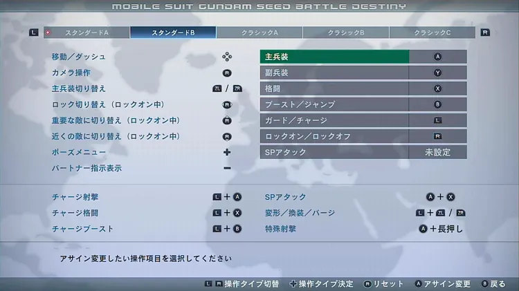 コントローラー設定では、基本の操作方法となる「スタンダードA/B」と、主兵装切り替えボタンなどが変更された「クラシックA/B/C」が存在する。