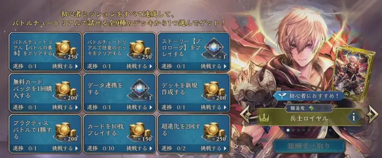 初心者ミッションを全て達成することで構築済みデッキ1個を入手可能
