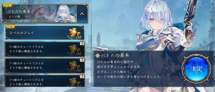バトルの基本クリア後にバトルチュートリアルという初心者デッキの動かし方を学べるチュートリアルが発生。