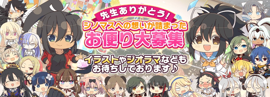 募集内容は、ゲームやキャラクターに対するお便り、シノマスへの想いやメッセージ、シノマスを始めたきっかけなど、自由なテーマで応募OK。また、画像の投稿やジオラマ作品も受け付けている。