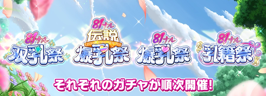 同じく週替わりで爆乳祭・伝説爆乳祭・双乳祭・乳籍祭のカードが登場するガチャ。爆乳祭カードに関しては、恒常入りしていない対象がピックアップとなる。