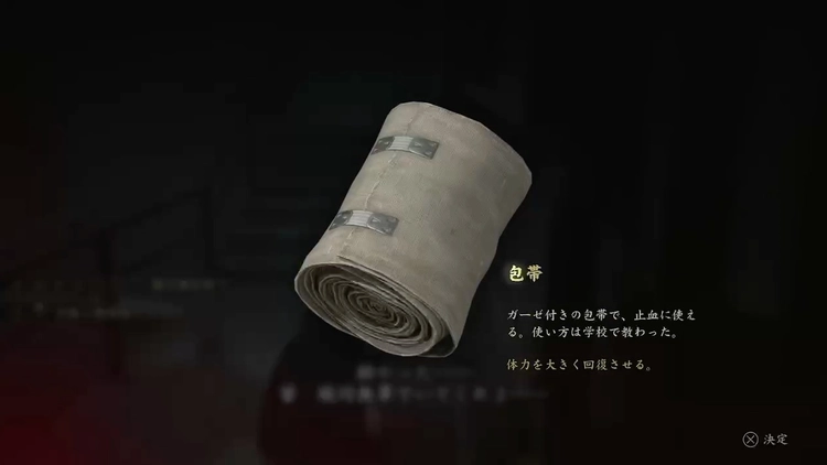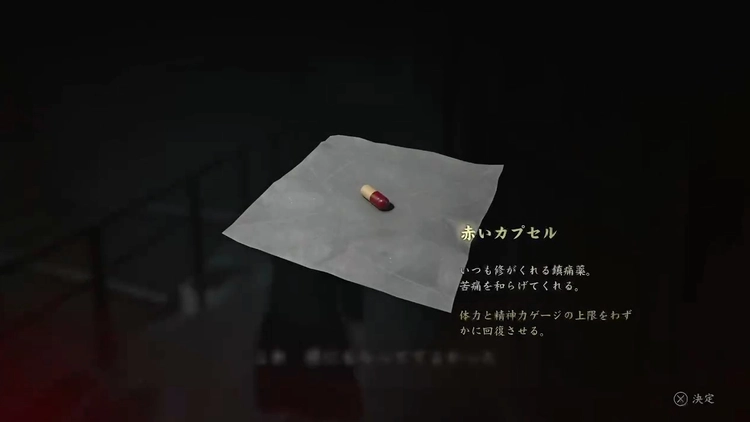 霧のバケモノから逃げ切った後、雛子の体力が減少している。修からもらった赤いカプセルを使用して体力を回復しよう。