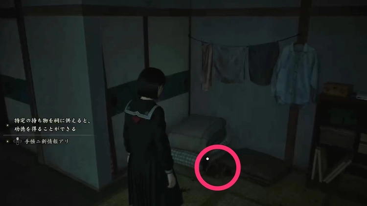 勝手口の先は行き止まりだが、梯子で降りたスペースにお守り【クジラ】が落ちているので、民家を後にする前に回収しておこう。