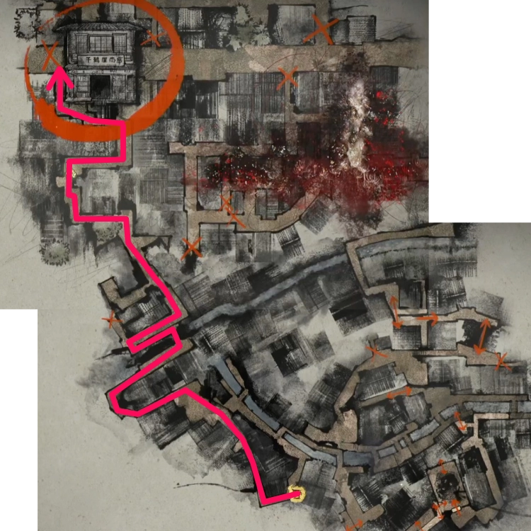 道中、トラックが道を塞いでいるので、抜け道を使って千鶴屋を目指そう。