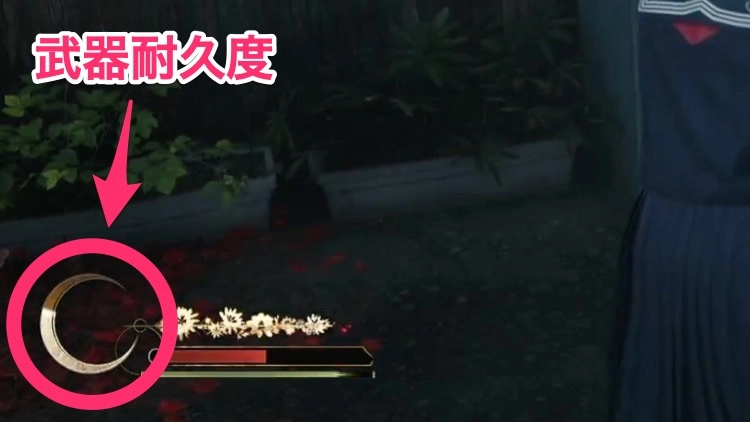 体力ゲージの左に表示されている月の形のゲージは、武器の耐久度を表す。武器の耐久度が無くなると、壊れて使用できなくなるので、工具袋を使用して壊れる前に耐久度を回復させよう。