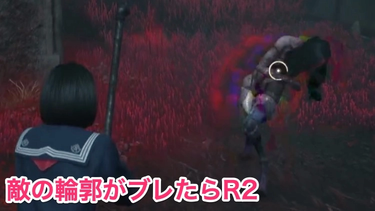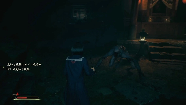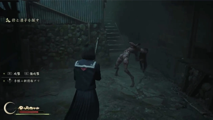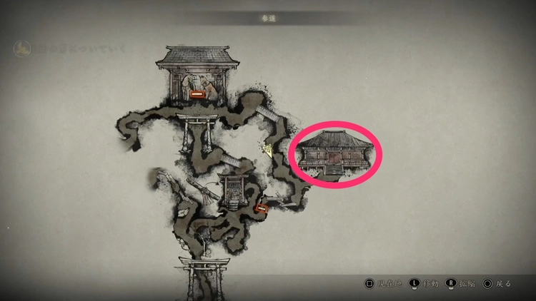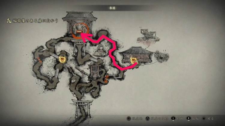 道中、赤い霧の影響で集中ゲージの上限が減少していく。バケモノが出現するが、無理に戦闘する必要はないので、回避を駆使して逃げながら稲荷像を目指そう。