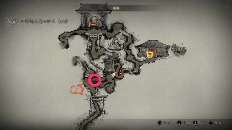 それぞれの絵馬は1箇所ではなく各地に散らばっているので、1個正解の絵馬を見つけたら、別の場所の絵馬掛けを調べて正解の絵馬を全て見つけよう。