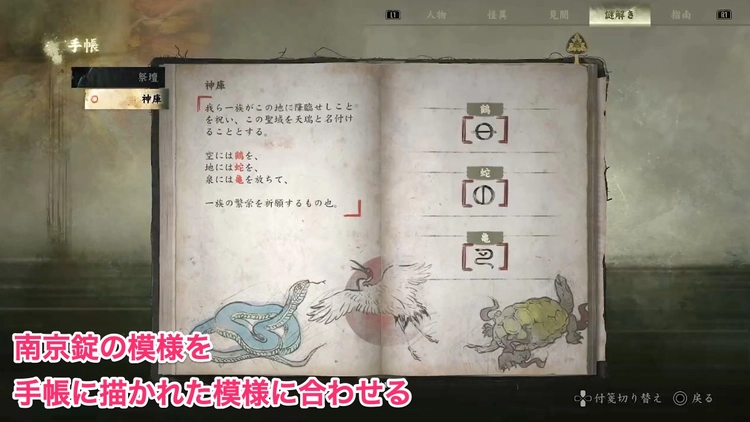 正解の絵馬を全て調べたら、神庫へ戻り模様を合わせて錠を開けよう。模様の順番は手帳から確認できる。