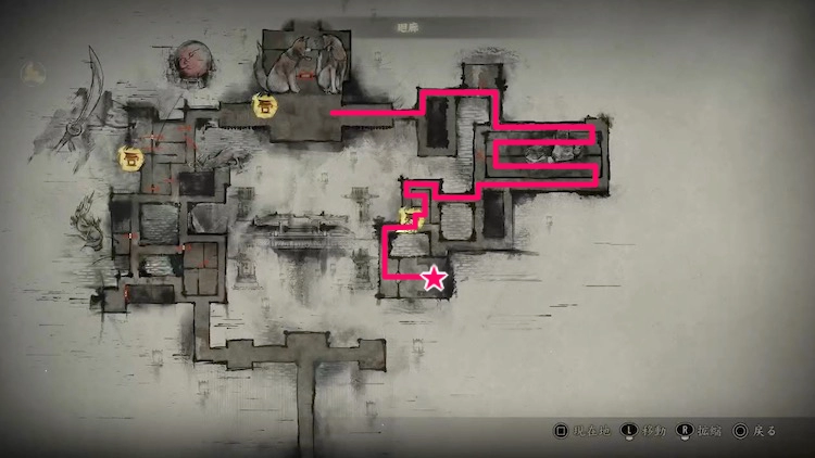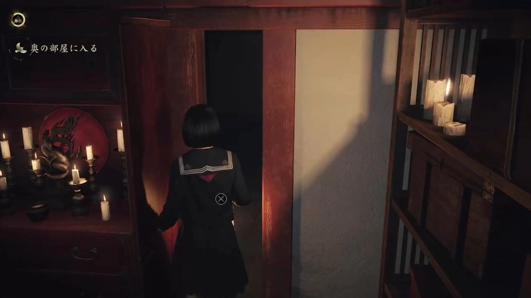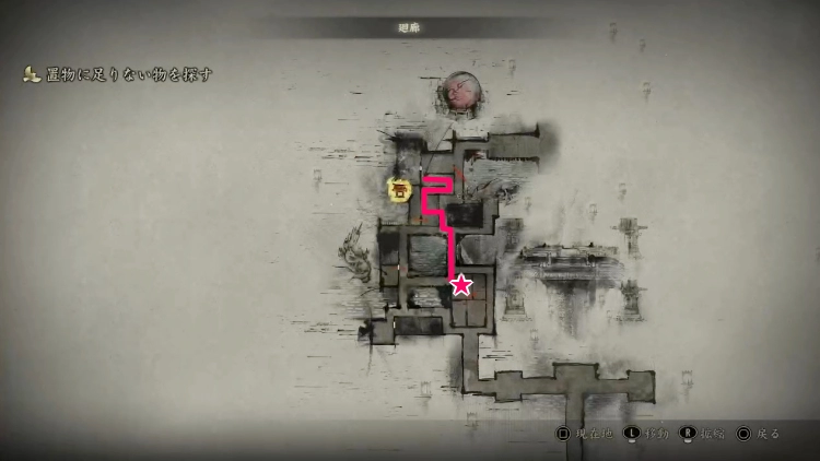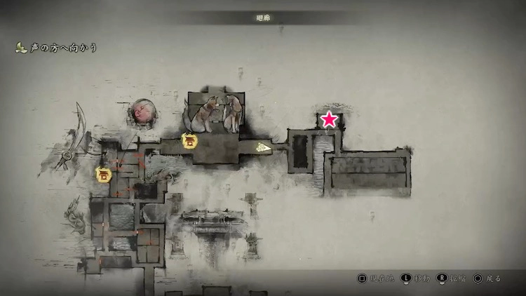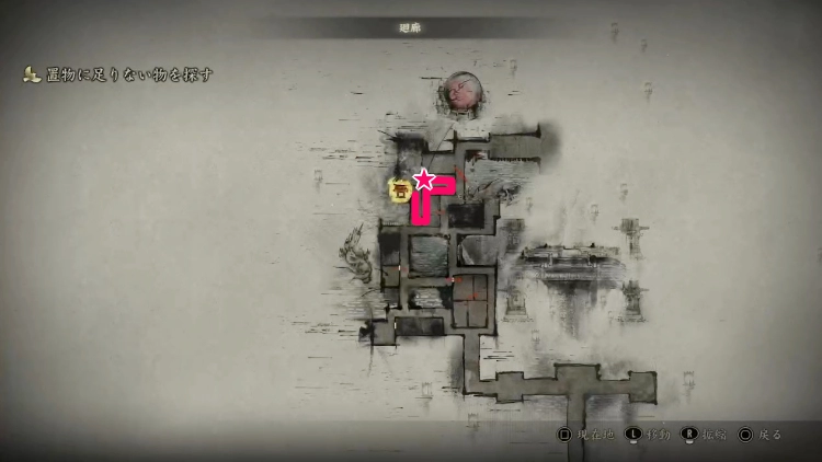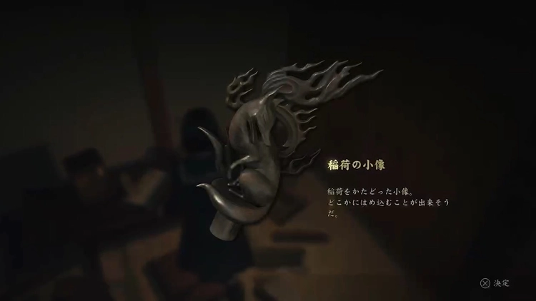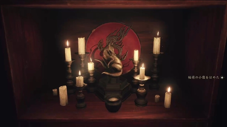 奇妙な置物の場所へ戻り、稲荷の小像をはめ込むことで、棚全体がスライドして奥の部屋へ入れるようになる。