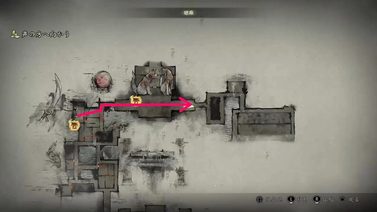 廻廊に辿り着いたら、まずは探索を進めて「木札付きの鍵」を入手しよう。