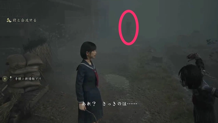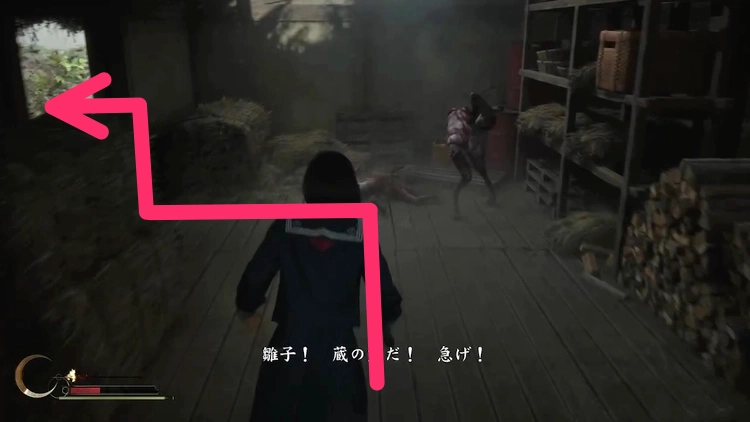 蔵の中にも人形型のバケモノがいるが、無視して特に問題ない。左手にある窓から屋外へ出ると、ムービーが発生し、修と合流できる。