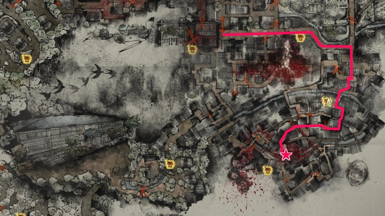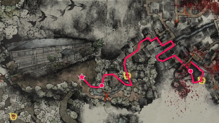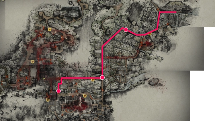 マップ画像の●の位置で、それぞれムービーが発生する。前回の夷ヶ丘と比較して、通れる道に変化はあるが、特筆するような追加の探索要素はないため、最短で千鶴屋へ向かってしまって問題ないだろう。