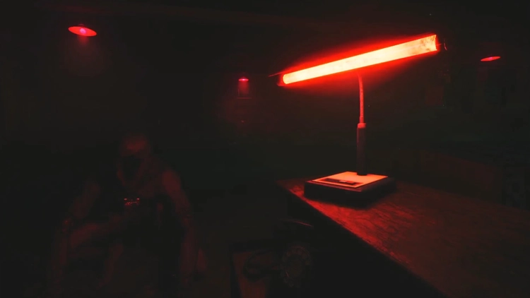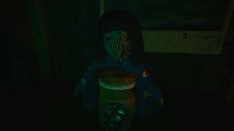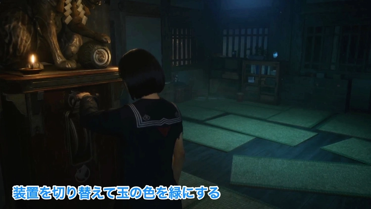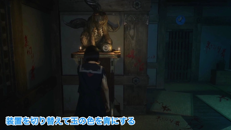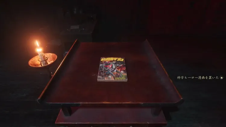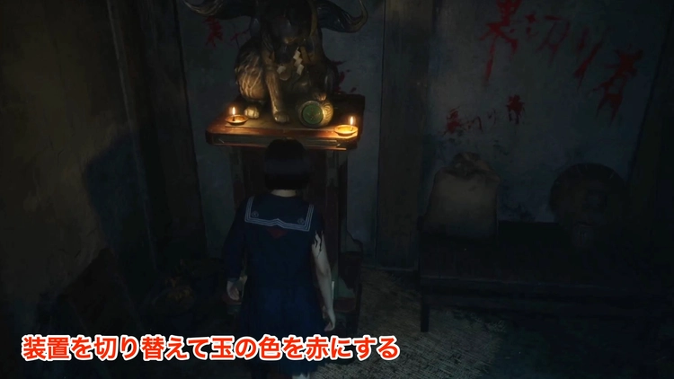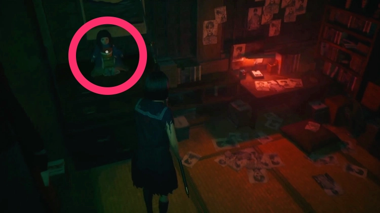 光が赤い状態で、電気スタンドの脇の棚の上にある人形を調べると、人形を半回転させる演出が発生する。