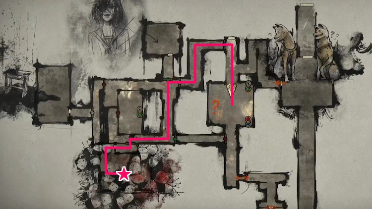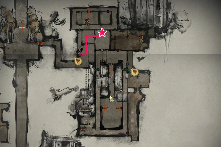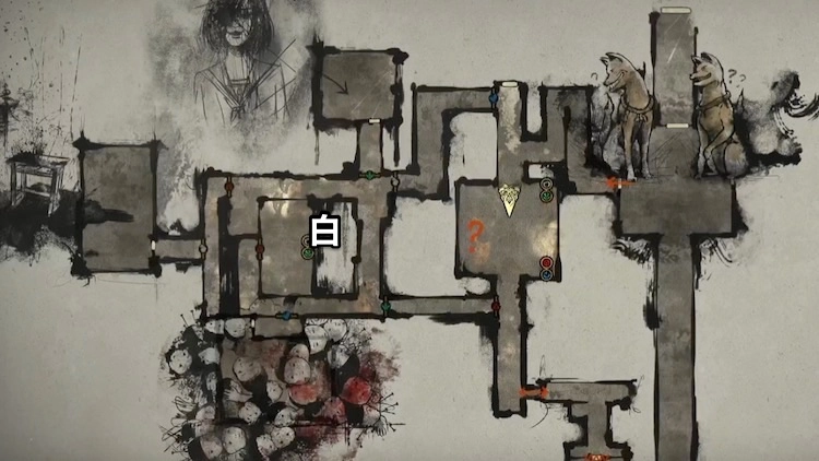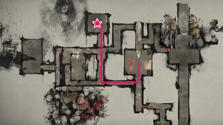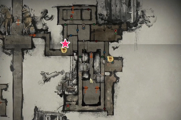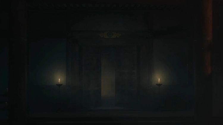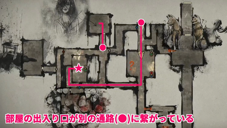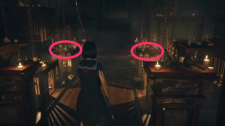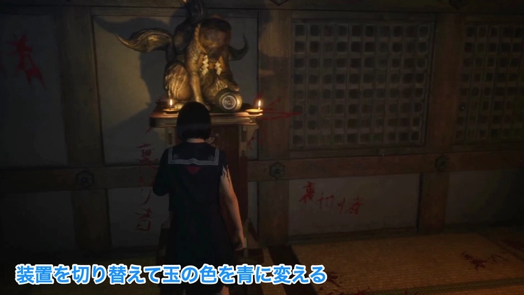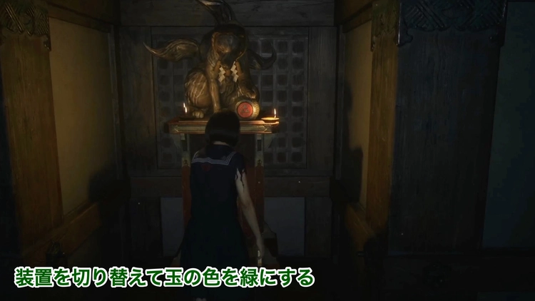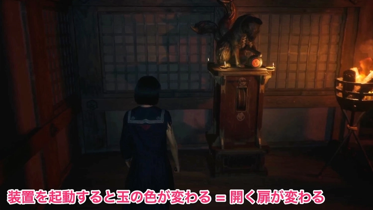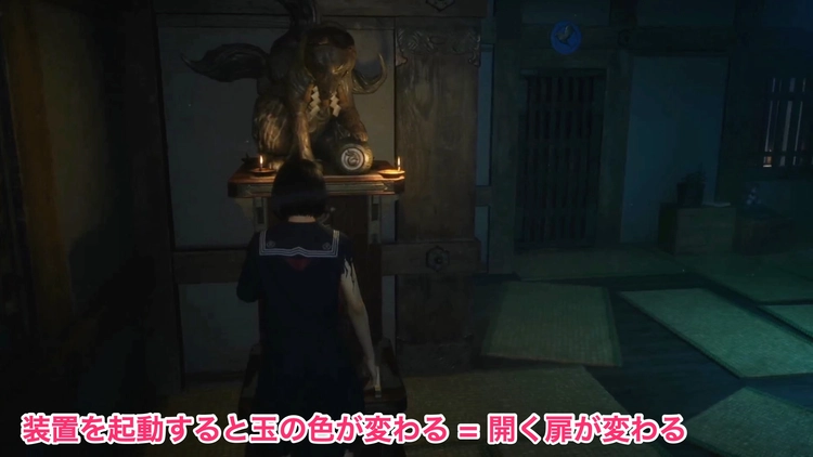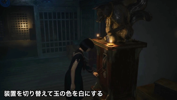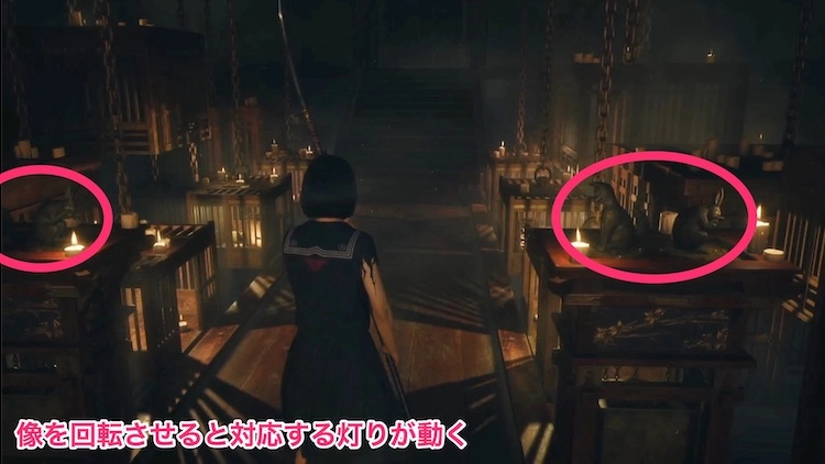 座敷牢へ続く通路にある4つの像を調べて回転させると、それぞれ対応する灯りが動く仕組みになっている。