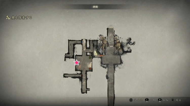 中央の大扉の左右の狐の像の台にある鍵穴を調べることで、対応する両脇の扉が開く。まずは左右の扉の先を探索しよう。