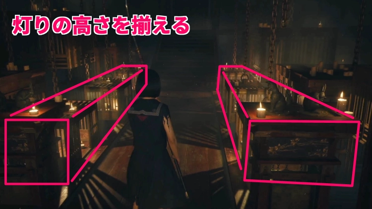うまく灯りの高さを揃えることができると、謎解きクリアとなる。