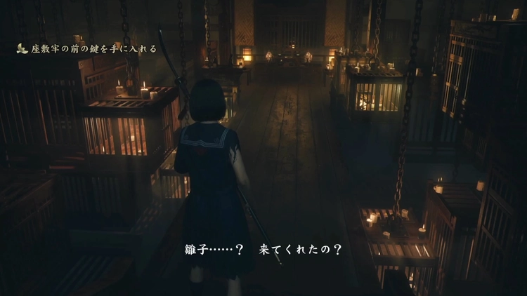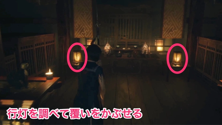 座敷牢の両脇にある行灯に、回収した2つの覆いをかぶせよう。