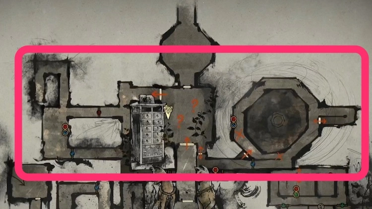 左の扉の先の籠牢では、仕掛けにはめる物を3つ見つけることがひとまずの目的となる。