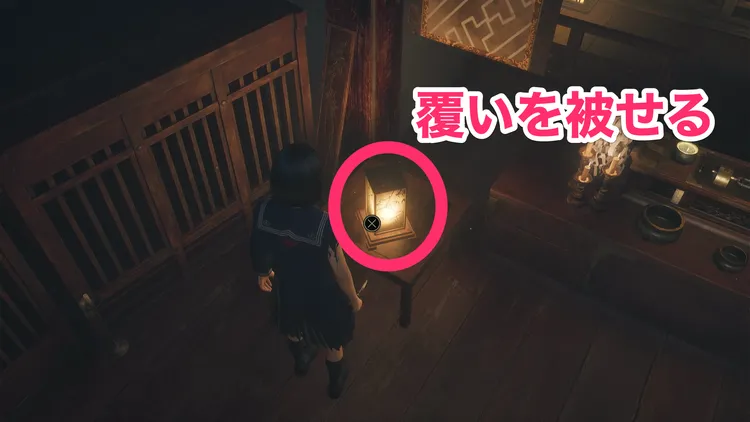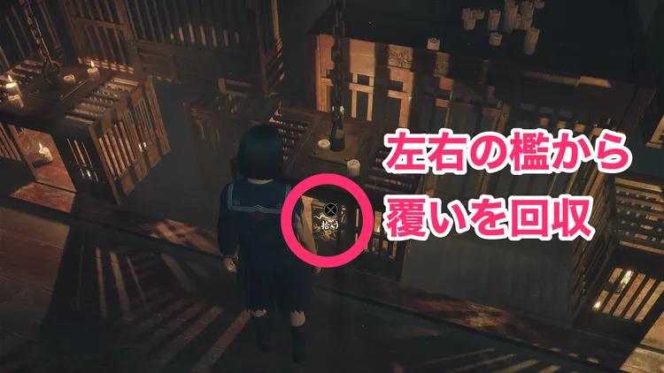 神座の左右にある灯りに入手した覆いを被せると謎解きはクリアとなる。