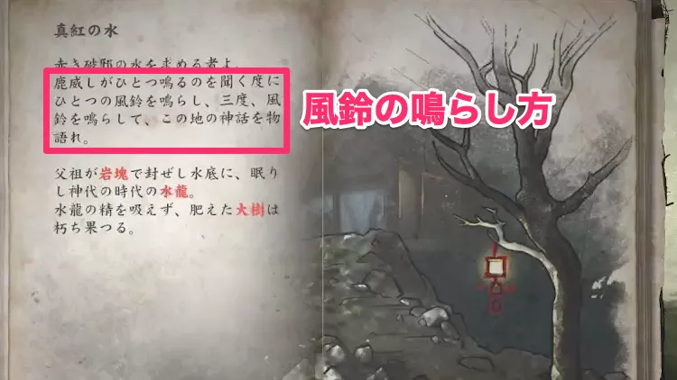 真紅の水の謎解きは、ししおどしの音が鳴った後に正しい順番で風鈴を鳴らすとクリアできる。ししおどしの「カタッ」という音の後に風鈴を鳴らそう。