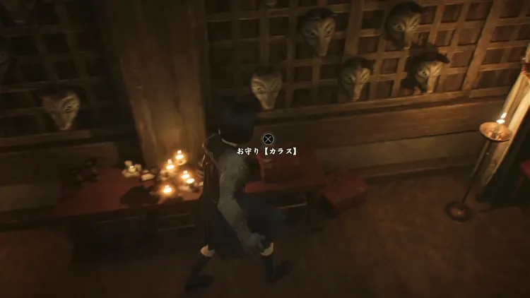 お守り【カラス】は、社殿一階の西にある隠し部屋にて入手できる。
