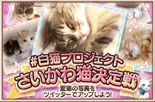 「#白猫プロジェクトさいかわ猫決定戦」を付けて、猫の画像をつぶやいてください。