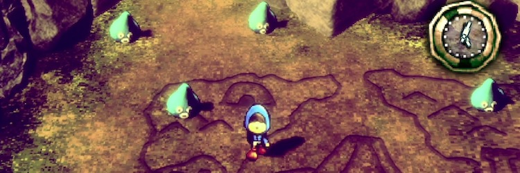 城下町の南のマップにあるオジャマな大岩は、つるはしを装備することで破壊できる。
