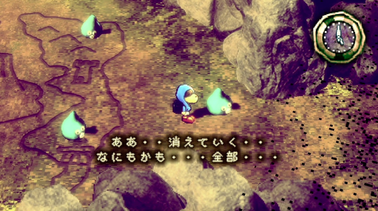 エリア右端にいる、虚無に一番近いスライムに話しかけると、ワールドマップと、エリアにいるスライム全員の記憶が消失するイベントが発生する。