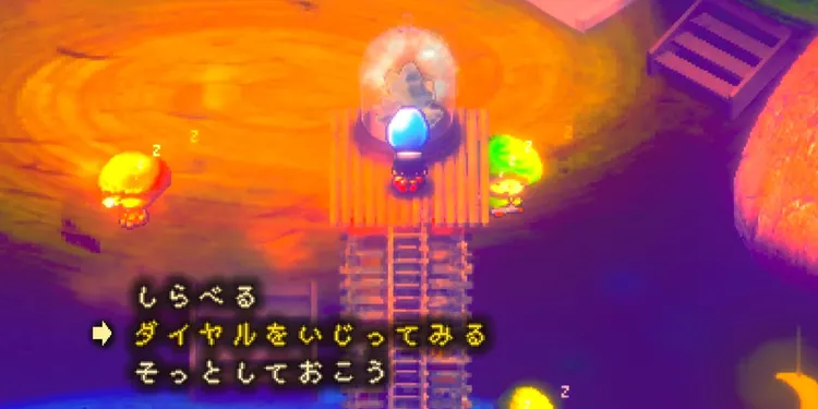 中央付近の広場にある機械のダイヤルをいじると、一部の住民が目覚めて会話できるようになったり、左下の通路が通れるようになる。