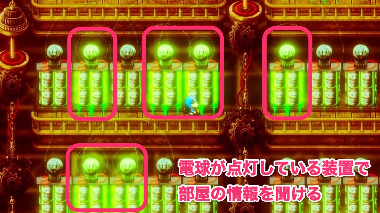 上部の電球が点灯している装置に組み込まれている電池から、ランダムに「部屋番号とその部屋の種類」を教えてもらえる。