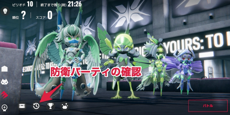 アリーナ防衛編成は、最後に使い勝利したパーティ編成がそのまま反映される仕組み。現在の防衛パーティは、アリーナ画面左下から確認できる。