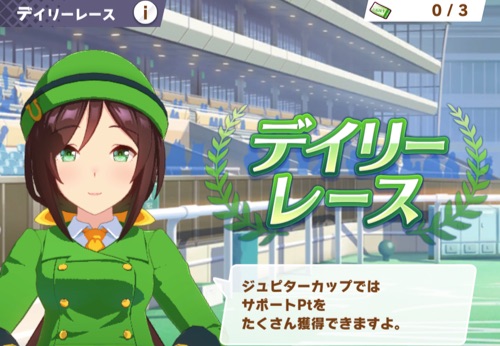 サポートPtを効率的に稼ぎたい場合は、デイリーレースのジュピターカップに出走するのがオススメです。1日3回まで挑戦でき、ジュエルの使用で挑戦回数を増やせるため最大6回まで出走可能です。