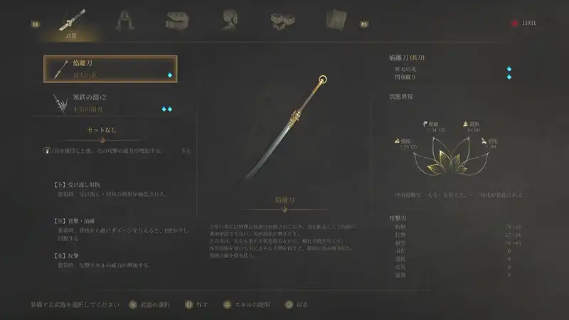また、流派スキルに返し剣をセットしておけば任意のタイミングで回復の隙を作ることもできるので、紅嵐戦は長刀で挑むと良い。