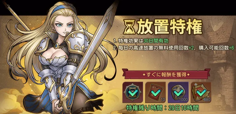 最大16時間分の放置報酬を毎日追加で回収できるようになるため、プレイヤーレベルを早く上げて各コンテンツをいち早く解放したい方には非常におすすめだ。