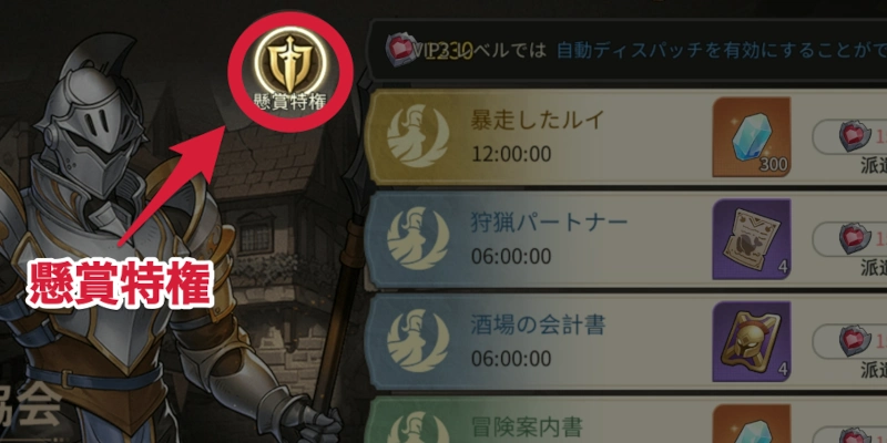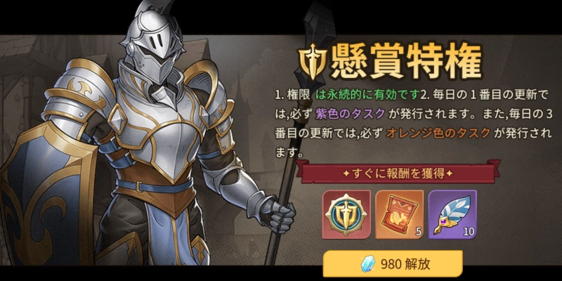 この任務を通じてアイテムを獲得できるが、ダイヤ980個で懸賞任務を開放することで、高ランク任務の発生率が上昇し、リターンを得やすくなる。