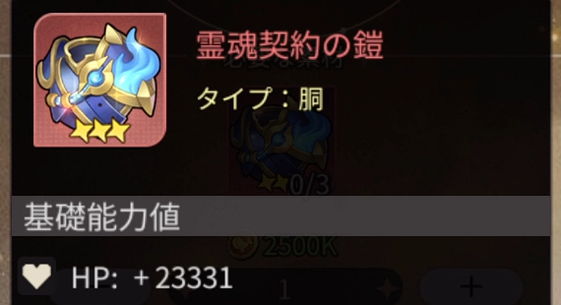 | 霊魂契約の鎧 | HP+23,331 | 同レア×2:HP+13% 同レア×3:攻撃力+18% 同レア×4:HP+10% |