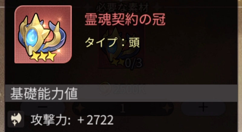 | 霊魂契約の冠 | 攻撃力+2722 | 同レア×2:HP+13% 同レア×3:攻撃力+18% 同レア×4:HP+10% |