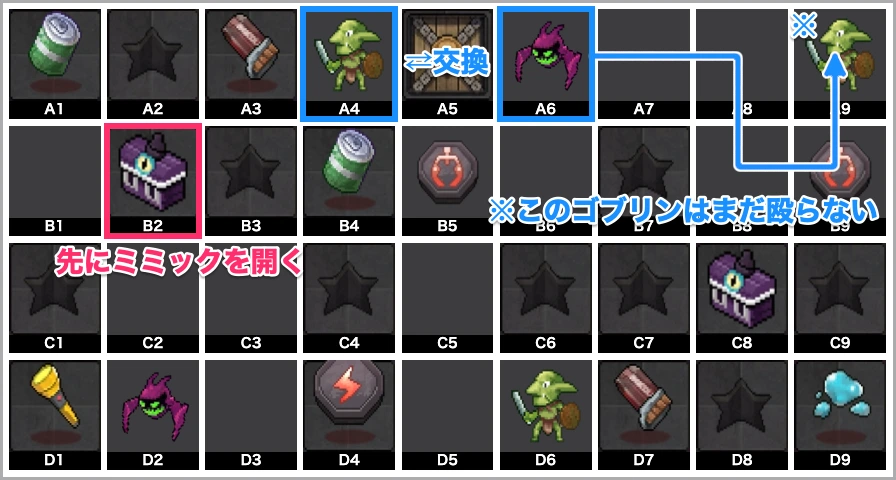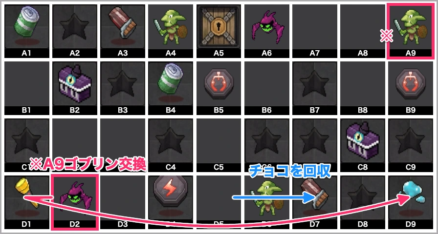 3. D2を踏み、コウモリとA9ゴブリンを魔石で交換