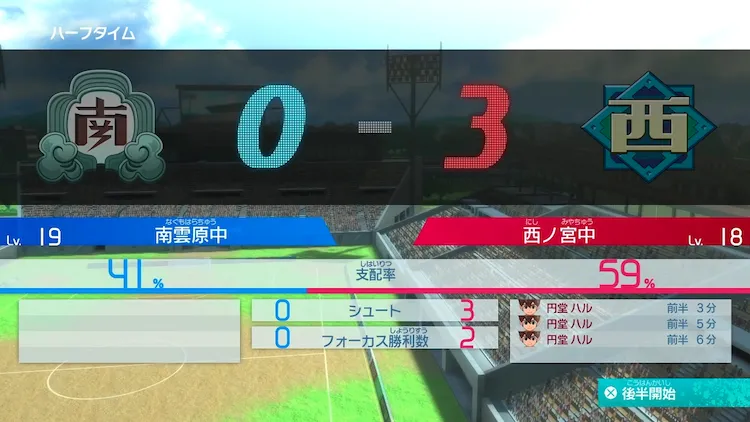 前半戦は、帰属校・助っ人システムなるルールを利用し、雷門中の2人が西ノ宮中の選手として登場する。雷門の2人が大暴れして必ず3失点することになるため、前半はある意味消化試合と思ってOKだ。