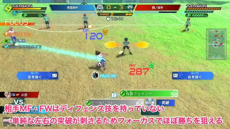 西ノ宮中のFW・MFは全員DF技を持っていないため、「ボールを持った状態で相手FW・MFにぶつかる→フォーカスで勝つ」の流れを何回も繰り返すことで、容易にテンションを稼ぐことができる。
