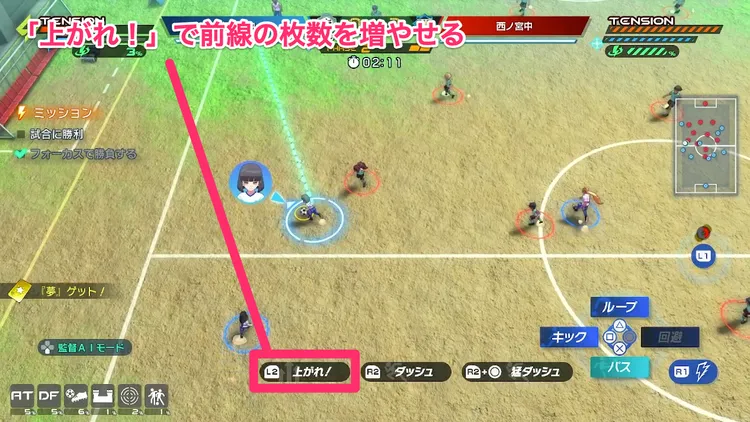 L2ボタン長押しで、選手が前線に集まる「上がれ!」の指示を出すことができる。